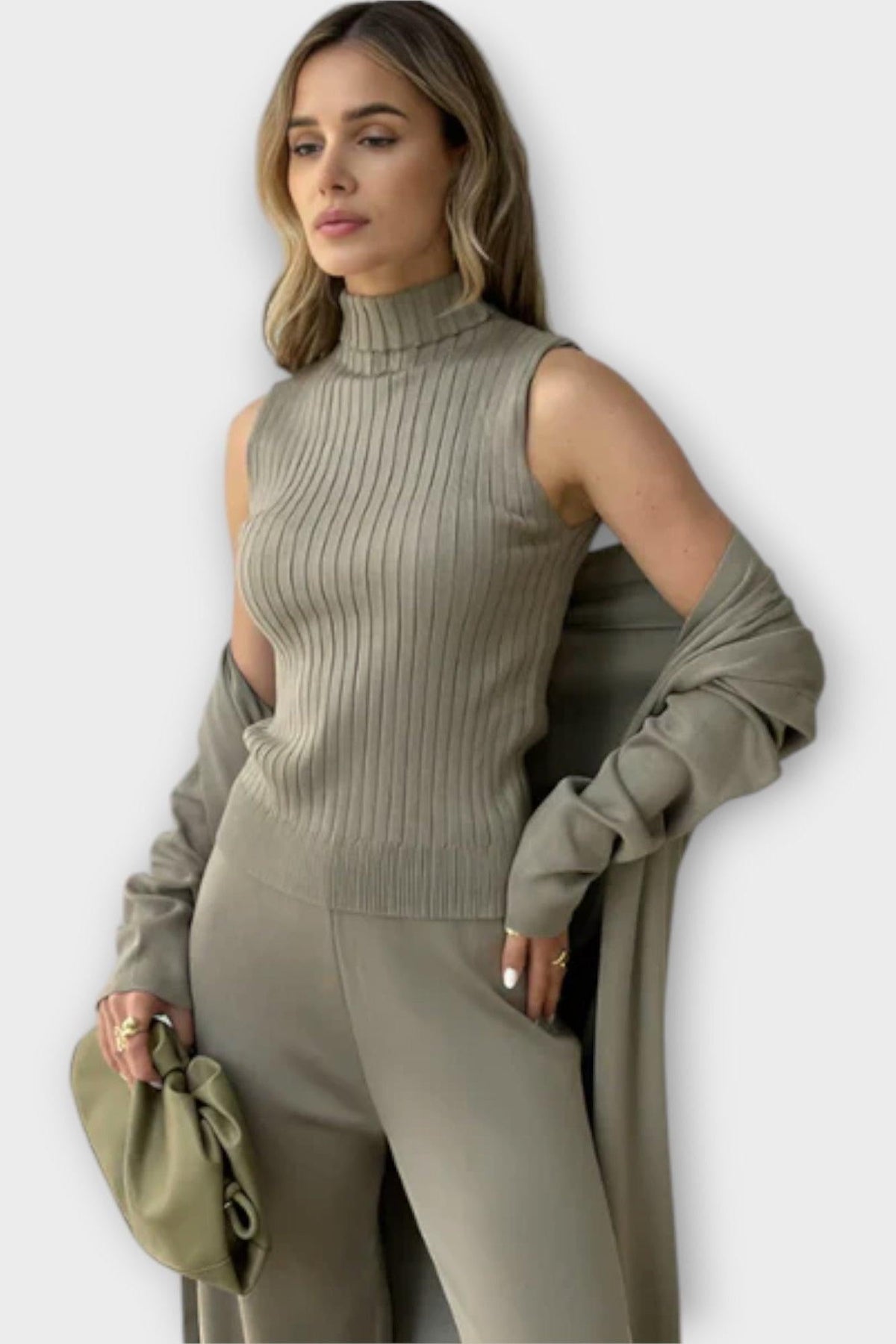 Stine | Conjunto de Malha Canelada irradia luxo intemporal através de um artesanato de alta qualidade. O conjunto é feito em fina malha canelada, que proporciona calor, drapeado elegante e um ajuste confortável. Consiste em três peças — calças retas, um top de gola alta sem mangas e um casaco longo sem botões — que podem ser usadas em conjunto para um look harmonioso ou em sobreposição para máxima flexibilidade. A forma minimalista e refinada confere valor atemporal e um verdadeiro apelo para colecionadores. A disponibilidade limitada reforça a exclusividade e o valor de investimento do conjunto.