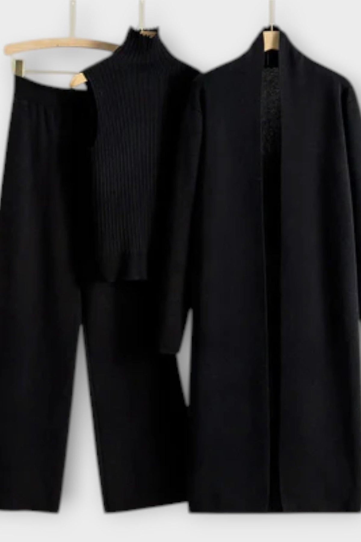 - Três peças — calças retas, top de gola alta sem mangas e casaco longo sem botões; use em conjunto para um look coeso ou em sobreposição para máxima flexibilidade.